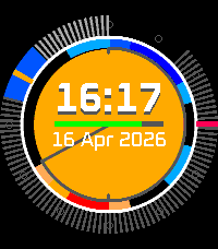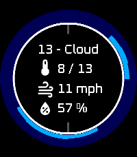 Daily weather at a glance - a watchface with a minimal design, with general weather conditions for the whole day shown around the outside of the main arc, and relative temperatures around the inside. Sunrise and sunset are also indicated. If an hour is 'clear' weather, no arc segment is shown. Temperatures are shown relative to the min/max for the day - coldest is darkest blue with two extra gradations for 1 and 2 degrees above, and hottest is darkest red with a similar scheme of two ligher shades. Greys represent clouds. Black and white watches will see solid white for rain/snow/fog/storms etc, When shaken, the outer weather arc is replaced with chance of precipitation. The thicker the segment, the higher chance of rain. Other current weather data is also shown, such as wind speed and humidity. The battery level is shown in the middle bar, and is green/white when Bluetooth is connected or grey otherwise. App configuration includes choice of temperature/wind speed units, background color, and disabling of animations. Data from OpenMeteo