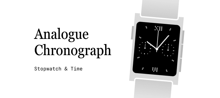 Chronograph Stopwatch based on 'analogue dots' Watchface. --- - press 'down' for start/pause/resume - press 'up' for reset Display: - large hand for 'seconds - small left dial for 'subseconds' - small right dial for '12 minutes' - also displays current time in min/hrs Settings: - if Autostart is enabled, stopwatch will automatically start running when opening the app.