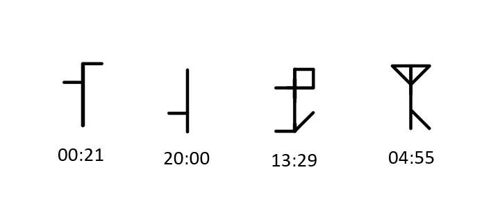24h in cistercian numerals. https://en.wikipedia.org/wiki/Cistercian_numerals In thirteen century medieval Europe, monks of the Cistercian order developed a numeric system where a single glyph could encode a number up to 9999. This watchface makes use of numbers up to 2359 to encode the time. Digits are based on a horizontal or vertical stave, with the position of the digit on the stave indicating its place value (units, tens, hundreds or thousands). These digits are compounded on a single stave to indicate more complex numbers