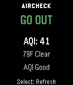 Health & FitnessAirCheck gives you a fast, simple answer to one question: should you go outside right now? Using real-time air quality (AQI) and weather data, AirCheck gives you a simple, instant recommendation: GO OUT CAUTION STAY IN Features - Real-time AQI and weather courtesy of Open-Meteo - Temperature-aware recommendations - Thunderstorm safety override - Clear reason text explaining each recommendation - Simple, easy-to-read interface - Manual refresh on launch and button press - Works across all Pebble watch types No clutter. No confusing settings. Just a clear answer when you need it.