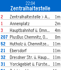 DailyNie wieder einen Bus oder eine Bahn verpassen! Konfiguriere deine drei meistgenutzten Haltestellen und zeige für diese die nächsten Abfahrtszeiten (inklusive Verspätung) auf deiner Pebble an! Funktioniert für Bus- und Bahnhaltestellen in Chemnitz und Umland. Hinweis: Alle Angaben ohne Gewähr. Die App und der Autor sind unabhängig von Verkehrsbetrieben und Verkehrsdienstleistern!