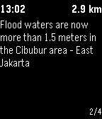 DailyOn-Hand Flood Alerts FloodWatch is a Pebble app that shows nearby reports of flooding in Jakarta, Indonesia. Reports are collected from the open source flood map PetaJakarta.org. The app lists reports within five kilometers of the watch location, and displays the time the report was listed and the current distance from the watch. The app allows the user to select individual reports on the watch to view more details.