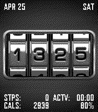 Combination Lock is a digital watchface that displays time in form of mechanical numerical lock Also shown: Date 📅 Battery charge 🔋 Steps taken 👟 Calories burned 🔥 Active time ⚡ Shake the watch to get the latest stats