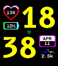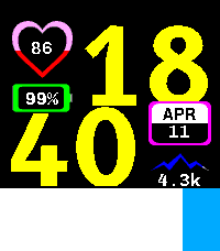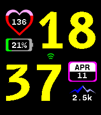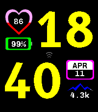 Contour is a Time 2 watchface. It permits you to set and follow your daily steps count and you heart rate with a gauge based on your maximum heart rate. Connectivity icon is green when connected and dark gray otherwise. Battery background is electric blue when charging and dark gray otherwise. It is compatible with QuickView Timeline. Code is open source, feel free to fork it or contribute via issues or PR.