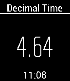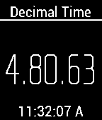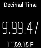 Used during the French Revolution, Decimal time has 10 hours in a day, 100 minutes in an hour, and 100 seconds per minute. Since decimal time has no practical use other than being an oddity, in the settings, you can have the real time shown in 12 or 24 hr format. Also, in settings you can turn seconds off. Also, you will notice that the decimal time seconds often seem to skip. That is because one decimal second is actually a fraction (0.864) of a normal second and the clock is only updated every normal second.