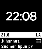 Digital watchface that shows information about finnish public holidays. Data is retrieved from web service (cupla.net). Same in Finnish: Digitaalinen kello, joka näyttää tietoja yleisistä juhlapyhistä ja muista merkkipäivistä. Tiedot haetaan päivittäin web-palvelusta (cupla.net).