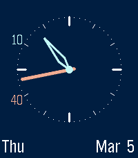 Clearly show the time & date. Primarily analog, with digital hints. For color displays, use a different color for hours vs minutes. Avoid overlapping when the hands are near each other by moving the minute numbers.