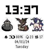 I recently replayed Dragon Quest Monsters (aka Dragon Warrior Monsters) and decided to need a watchface for this. So here it is. It shows various watch related information: time, date, day of week, bluetooth, quiet time and battery. Also you can have three monsters visible. The monster selection is done by breeding in the settings page. In order to breed you need power, gained by sleeping. You will unlock new base monsters by walking.