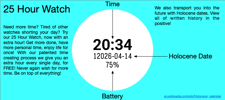 Need more time? Tired of other watches shorting your day? Try our 25 Hour Watch, now with an extra hour! Get more done, have more personal time, enjoy life for once! With our patented time creating process we give you an extra hour every single day, for FREE! Never again wish for more time. Be on top of everything!