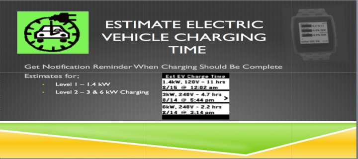 Estimate the time it will take to charge your Electric Vehicle (EV) and get notification when it is to be charge complete. The estimate is based upon knowing/setting the vehicle battery size and the vehicle initial SOC (State Of Charge) when you start charging. Estimates are made for Level 1 ( L1 @ 1.4 kW) and Level 2 (L2 @ 3kW & 6kW) capacity chargers. You can exit> the application after you advance through the screens and you will be notified with vibration at the time when L1 or L2 is at 100%. You can reset> if you want to cancel this reminder or start with a new charge cycle estimate. For these estimates to be accurate you will need to know and configure your initial battery capacity and set the initial SOC when you start your charging cycle.