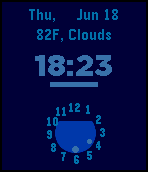This is my first watch face... The coding isn't the best. Vibrates and updates corresponding parts of screen on Bluetooth connect and disconnect along with charger connect and disconnect. Has a basic analog clock which uses a large dot to signify the hour (always points to the current hour number (1 - 12) - updates each hour) and a smaller dot to signify the minutes (only points to the current minute number (1 - 12) - updates every five minutes.). Includes a digital clock, local weather in Fahrenheit, and a bar that grows every ten seconds to act as a second hand. Also displays day of week and date. 12 or 24 hour format depending on watch settings. This is the colored version of my original face, Faze. This face has three themes that can be cycled through by flicking the pebble downwards with its face pointing towards the ceiling.