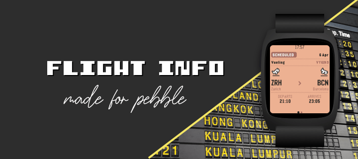 Never miss a flight update from your wrist. Pebble Flights lets you track any flight in real time — just enter a flight code or scan your boarding pass, and get departure and arrival times, gates, terminals, destination weather, and more, right on your Pebble. Features: - Boarding pass scanner: Upload a photo of your boarding pass from the app settings. The app reads the barcode automatically, extracts your flight code, and displays the QR code on your watch — handy for quick gate scans. - App settings: Set your flight code, temperature unit, and time format directly from your phone. Light and dark mode supported. - Destination weather: See current temperature and conditions at your arrival city. Timeline pins: Add your flight to the Pebble timeline from the options menu. How it works: 1. Enter a flight code on the watch or upload a boarding pass from the phone settings. 2. The app fetches live data through your phone and displays it across multiple pages — route, times, details, weather, and your boarding pass QR code. What you'll see: Real-time flight status, departure and arrival times, gate and terminal info, destination weather, and your boarding pass barcode — all at a glance. Made for Pebble.