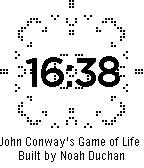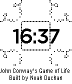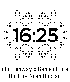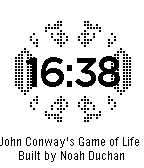 This watchface displays the time overlaid on a running simulation of John Conway's Game of Life. Shake the watch to reset the game to one of three initial setups. Rules of the Game of Life: For each cycle of the game... - A live (black) square remains live if and only if it has exactly 2 or 3 live neighbors. Otherwise it dies (turns white) - A non-live square becomes live if it has exactly 3 neighbors. Otherwise it stays non-live Note: A portion of the code for this watchface was taken from the tutorial on the pebble website, since it was created by modifying that tutorial