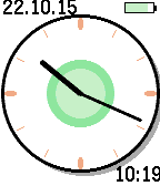 Animated color Pebble watchface. Expands from a dot, sweeping the clock arms as it does so. There are two inner circles inside the clock face. One is filling up the clock face every hour, one for the whole day. Battery load is displayed as well as the date and the time in digital letters.