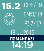 Hava Durumu v1.0 Bulunduğunuz yerin hava durumu ve sıcaklık bilgisini anlık ve 3 günlük (bugün ve sonraki 2 gün için günün en düşük ve en yüksek sıcaklıkları) olarak gösterir. Ayarlardan renkleri ve güncelleme yoğunluğunu değiştirebilir, saniye gösterimini açıp kapatabilirsiniz. Not: Sadece Türkiye'de çalışır. İstanbul dışındaki illerde merkez ilçeler dışında hava durumu gösterimi yapılmamaktadır. Veriler mgm.gov.tr'den alınmaktadır.