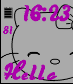 Hello Kitty with a battery meter and current temperature (in Fahrenheit).