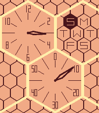 A watchface with tessellating hexagons. The top left hexagon shows an analog hour dial. The bottom center hexagon shows a minute dial. The top right hexagon highlights the day of the week.