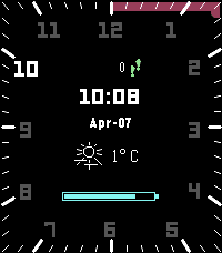 Minimalistic Hybrid watchface. Numbers change color to change the current hour and progress bar shows current minutes. It shows current weather temperature, battery and step count.