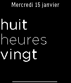 Imprécise is a french textual watchface, printing hour with a variable (im)precision. Date of the year is shown at the top of the screen. A line at the bottom shows the battery charge (the shorter the line, the less battery you have !) and a small cross appears on the bottom left whenever you lose the bluetooth connection.