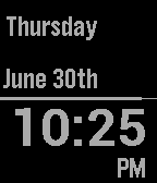 The Keep It Simple watchface displays the non-abbreviated day of the week, date to include the non-abbreviated month & day number, time (in the largest system font available), and displays AM/PM for 12-hour mode. A horizontal bar in the middle of the screen appears to be decoration. But it is actually a covert battery level indicator. As the battery depletes, the bar retracts to the left uncovering a much thinner line beneath. Others will think it's art. But only you will know it's time to recharge your watch. Designed specifically for the Pebble and Pebble Steel.