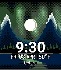 # Lumen Ridge **A cinematic landscape watchface for Pebble** Transform your wrist into a living alpine window. Lumen Ridge brings a serene mountain landscape to life with layered peaks, pine forests, a reflective lake, and a dynamic sky that shifts smoothly through dawn, golden hour, day, sunset, and deep night — all perfectly synchronized to your local sunrise and sunset times. When darkness falls, the aurora borealis appears in flowing, glowing curtains. Choose from four stunning color palettes: Classic Green, Purple/Pink, Blue/Cyan, or Multi-color Rainbow. ## Features - **Live Weather Reactivity** The entire scene responds to real-time weather. Clear days show bright sun and calm lake reflections. Clouds roll in as soft, drifting layers. Rain brings visible falling drops and gentle ripples across the lake. Snow adds accumulating white caps on the mountain peaks and drifting flakes. Thunderstorms deliver dramatic lightning flashes against a darkened sky. - **Real Sunrise & Sunset** The sun and moon rise and set at the correct times for your location, creating smooth, beautiful sky transitions throughout the day — soft pinks and oranges at dawn, bright blues during the day, deep oranges and purples at sunset, and rich navy at night. - **Accurate Moon Phases** The moon is drawn with the correct illuminated fraction each night, showing realistic crescents, quarters, gibbous, or full phases as it arcs across the sky. - **Configurable Aurora Borealis** At night and twilight, glowing aurora curtains ripple across the sky. Choose from four beautiful palettes. The aurora subtly shimmers even when static and becomes more lively and fluid during the 5-second wrist-flick animation. - **Step Progress** Elegant circular ring on round watches and a clean horizontal bar on rectangular models, perfectly integrated into the landscape. - **Temperature Display** Current temperature shown clearly in °C or °F (your choice). ## Touch & Widget Features on Supported Models On Pebble Time 2 and Round 2 you can tap the sky or aurora area to instantly cycle through the aurora color palettes. Heart rate monitoring is available as a widget option on Time 2, and you can also select a second timezone to display as an additional widget on color models. ## Settings - 12 or 24-hour time format - Step goal - Temperature unit (°C/°F) - Aurora color palette - Widget options - Weather animations (on or off) Fully optimized for every Pebble model — aplite, basalt, chalk, diorite, emery, flint, and gabbro. Black-and-white watches get carefully dithered rendering; newer high-resolution models (Time 2 / Round 2) show extra detail and smoothness. Lumen Ridge is a loving evolution of Reno’s Weatherland and Fisheye Weather, combined with the clean style of SolarWorld. Enjoy the view. 🌌