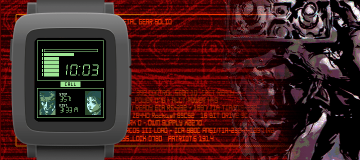 This is my Pebble Time version of preman_pasar's Amazfit Metal Gear Solid watch face. The signal strength indicator is used to display the Pebble's battery. Each increment represents approximately 15 percent of the watch's battery. The user's steps and distance traveled (in meters) metrics are displayed in the lower center portion of the screen.