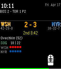 NHL Live Scores 🏒 Can't watch your favorite team's game? Now you don't have to — strap it to your wrist. NHL Live Scores is a Pebble watchface that keeps you up to date on live NHL action without ever pulling out your phone. What It Does Live scores with team abbreviations in team colors Period & time remaining for the current period Shots on goal for both teams Power play indicator — know when your team is on the man advantage Last goal scorer displayed in real time Team records (W-L-OTL) for both teams Goal celebration — animated goal light flashes when someone scores 8-bit icons — stick & puck during play, Zamboni during intermission Playoff series status — shows series record instead of season record during playoffs Next game — when no game is live, shows the next scheduled match-up Battery bar at the bottom of the screen Scrolling ticker of other games around the league