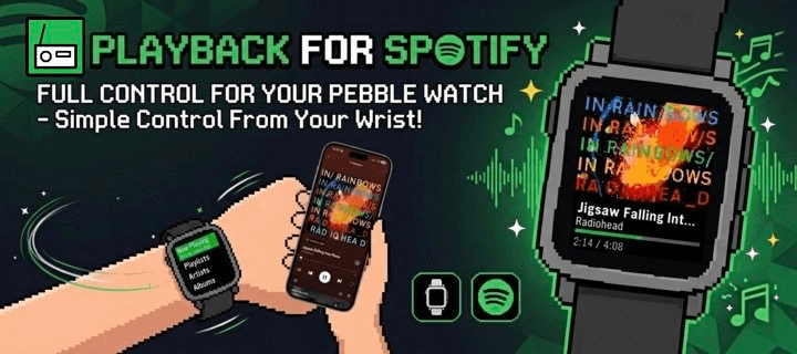 Playback for Spotify Control Spotify from your wrist without reaching for your phone. Features -Now Playing: Track info, live progress bar, and album art (full color, dithered B&W, or full-screen on round displays). -Library Access: Browse and play from your Playlists, Saved Albums, Followed Artists, and Liked Songs. -Queue Support: Access your upcoming tracks directly from your wrist. -Advanced Playback Menu: Long-press 'Now Playing' on the main menu to easily toggle Shuffle and Repeat modes. Controls -SELECT: Play / Pause -UP / DOWN: Next / Previous track -Hold UP / DOWN: Volume Up / Down (only works while playing on external speakers because of API limitation) -Hold SELECT: Toggle UP/DOWN buttons to Volume Mode (auto-reverts after 3 seconds) Setup & Requirements -Requires a Spotify Premium account and active playback on any device. -Setup uses secure OAuth (PKCE) and requires a free Spotify Client ID (a built-in tutorial will guide you). Supported Platforms: Aplite, Basalt, Chalk, Diorite, Emery, Flint, Gabbro. Open Source -Playback is fully open source. Check out the code, report issues, or contribute on GitHub: https://github.com/alex523ap/Playback-for-Spotify