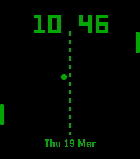 自動でピンポンをプレイし続けるウォッチフェイスです。時間表示がお互いのプレイヤーの得点を表しています。 This watch face automatically plays ping pong continuously. The time display shows the scores of both players.