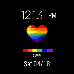 Just a simple pride themed watch face I made for the Round 2 Watch. It shows the time in 12 hour format, the Battery percentage in a rainbow bar, and the date.