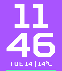 Simple digital watchface with: - Temperature from Open Meteo - Bar showing battery level at bottom of screen - Customsable colours (despite the name) as well as settings to disable temperature and date