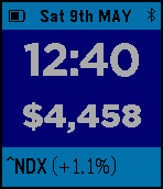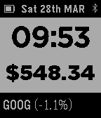 A watch face that also keeps tabs of your growing (or shrinking) share stock value - you enter the stock symbol, the price you bought it for, and the quantity and the watch face will show the current value you have gained (or lost). International stock markets (eg. Australia) require adding a prefix (eg. LNG.AX) to correctly lookup the prices. Settings allow for top or bottom time location, black or white face, and choose between showing the share $ total, share $ gain, or percent. There is a Pro version that allows for multiple shares to ticker scroll into view allowing you to watch several shares with speed control options etc.