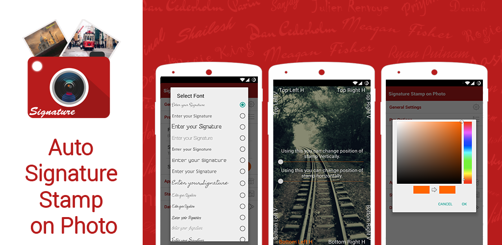 Many a times after seeing a particular image you wonder that it would have been perfect if that image would have had your name or Signature Displayed on it. But now with the help of "Signature Stamp on Photo" Application, you can insert any Text on the Image you click as part of your Signature very easily. Just Snap images as usual as you do and the Application will automatically insert your Preferred Text Signature on it where ever you want on the Image.