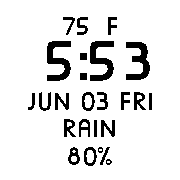 Simple design with time, date, battery life, weather temp, and weather conditions.