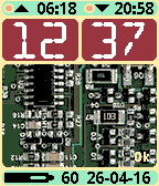 Skeleton watchface, aka open heart showing electronic components for the LCD display. Battery load display, BT connection warning. Sunrise and sunset display. 12-hour clock supported. Date format configurable. This is a paid watchface, price $3.95.