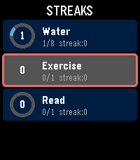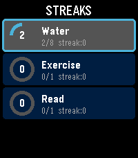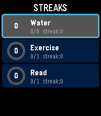 Track your daily habits and build streaks right from your wrist. Streaks is a simple, colorful habit tracker for Pebble that helps you stay consistent with up to 6 customizable daily goals. Set up habits like drinking water, exercising, reading, meditating -- anything you want to do every day. Each habit gets a vibrant progress ring that fills as you tap toward your daily goal. Complete your goal and feel the satisfying buzz. Keep going day after day to build your streak. Features: Track up to 6 daily habits Customizable names, goals (1-20), and colors for each habit Visual progress rings with completion animations Streak counter tracks consecutive days Best streak memory to beat your personal record Quick-tap to increment from the list, or open detail view for full stats Works on rectangular (Emery) and round (Chalk) Pebble watches Settings configurable from your phone via Clay Build better habits, one day at a time.