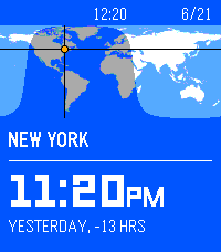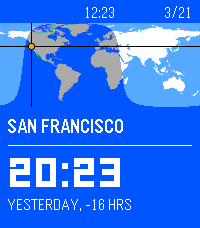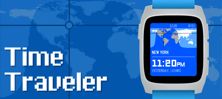 Remember the old days, when your digital watch would come preloaded with a bunch of cities throughout the world, and a world map prominently displayed on the screen? Wasn't it fun to just scroll through all those cities, wonder where all those abbreviations really were? That's why I created TIME TRAVELER, a fun, animated world time experience for the Pebble watch! Smoothly animates between cities around the world, showing real-time day/night data, accounting for time zones, summer time, and more! Features: - Real-time daylight terminator calculation, showing you exactly which cities are experiencing daylight and which aren't! - Hide or show your favorite cities, selecting from 49 different cities commonly found on Casioâ„¢ digital world time watches! - Shows you whether it is today, tomorrow, or yesterday for a given time zone -- now you can finally remember what day it is for your friends in Asia! - Exciting animations!