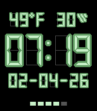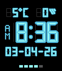 Time Weather Date Battery displayed on LCD font Weather display temperature and precipitation probability Time 12/24 Temperature F/C Color theme