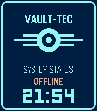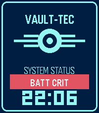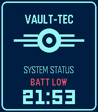 Yet another Vault-Tec watch face! It's pretty straightforward, but has a few options: - Battery is indicated as "OK", "BATT LOW" or "BATT CRIT". Thresholds for LOW and CRIT are configurable. - No options for vibrating on Bluetooth disconnect, but the watch face will display "OFFLINE" when disconnected. You can optionally turn this off if you don't want it.