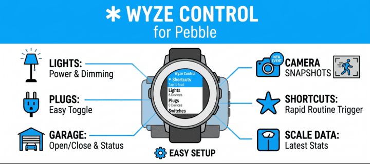 # Wyze Control for Pebble - Application Description ## A complete Wyze control center, built for Pebble **Wyze Control for Pebble** turns your smartwatch into a practical control surface for your Wyze smart home. Instead of treating the watch like a passive notification display, this app is designed for direct action: check device state, trigger automations, control lights, and view key information without pulling out your phone. It is optimized for the moments when a fast response matters. If you are leaving home and want to close the garage, in bed and notice a light is still on, or checking whether a camera recently captured motion, the app keeps the interaction short and focused. The experience is built around the Pebble philosophy of quick, glanceable, button-driven use. The app connects through the Wyze cloud via PebbleKit JS, so it can operate as a remote companion to your phone while still feeling lightweight on the watch itself. That makes it useful both for everyday convenience and for quick status checks when you are away from home. --- ## What the app is for Wyze Control for Pebble is intended for users who want the most useful parts of their Wyze setup available on their wrist. The app is focused on: - Turning devices on and off quickly. - Checking whether a device is online and what state it is in. - Triggering recurring automations and shortcuts. - Viewing important device information in a compact format. - Keeping the most common smart home actions available with minimal friction. The goal is not to mirror every phone-app function. The goal is to make the high-value actions faster and more convenient in a smartwatch-friendly workflow. --- ## Supported device categories ### Lighting Wyze lights are one of the best fits for wrist-based control, and the app gives them full attention. For compatible bulbs and light strips, you can: - Toggle power instantly. - Adjust brightness using simple preset steps. - Switch between common color or color-temperature options. This is ideal for the everyday tasks people actually do most often: dimming a room, setting a clean white light, or changing the mood of a space without navigating a larger mobile interface. ### Plugs and switches Plugs and switches are handled as straightforward on/off devices. That makes them quick to use for lamps, fans, appliances, and other simple loads where the only action that matters is whether the device should be powered or not. ### Cameras For Wyze cameras, the app goes beyond a simple name-and-status listing. It can display a thumbnail from the most recent motion event so you can get a quick visual clue about what happened at home. That makes the watch useful as a fast awareness tool. Instead of loading a full live view on your phone, you can check the most recent activity with a glance. ### Wyze Scale The Wyze Scale view is presented as a read-only summary of the latest available measurement data. Depending on what the cloud API provides, the app can show: - Weight. - Body fat percentage. - BMI. - Muscle mass. - Body water. - Measurement date and time. This turns the Pebble into a compact health dashboard for quick reference, without forcing you into a more complex mobile health app. ### Shortcuts and automations The app exposes Wyze shortcuts and rules so you can launch your existing automations from the watch. That is especially useful for recurring routines like "Goodnight," "Away," or any custom action sequence you already use in Wyze. Rather than recreating logic on the watch, the app acts as a fast trigger for the automations you already rely on. ### Garage door controller Garage control is treated as a special case because it is a high-value action where clear state matters. The app shows garage status in a way that is easy to interpret and provides large, deliberate controls for open and close actions. That makes it practical in real situations where you need to operate the garage while moving, carrying things, or simply not wanting to reach for your phone. ### Device visibility and state Even when a device is not actively being controlled, the app still tries to surface meaningful state. Device type, online status, current power state, and special flags are included so the menu itself is informative rather than decorative. The result is a watch interface that answers the most important question quickly: what is this device doing right now? --- ## How the experience is organized The interface is built to feel native to Pebble rather than like a shrunken phone app. ### Device-first navigation The app organizes devices into a list that is easy to scan and select. Once the list is loaded, you can move directly to the relevant device and then into the control screen that matches its type. This keeps the interaction model simple. You do not have to hunt through dense categories or repeatedly switch contexts just to perform one action. ### Contextual action screens Selecting a device opens a window that matches that device’s purpose. Lights expose lighting controls, cameras expose preview behavior, the scale shows health data, and garage devices expose garage actions. This matters on a watch because every extra layer of irrelevant UI adds friction. The app reduces that friction by showing only the controls that make sense for the selected device. ### A consistent title bar Every screen uses a persistent app title, "Wyze Control," so the watch always has clear context. On a small display, that kind of consistency improves readability and makes the app feel cohesive as you move between screens. ### Glanceable by design The UI emphasizes readable labels, current state, and direct actions. It is intentionally not a dense dashboard. It is a quick-answer interface for moments when you want to know something or change something immediately. --- ## Real-world use cases The app is especially effective in ordinary day-to-day moments: - You are leaving home and need to close or check the garage. - You are in be